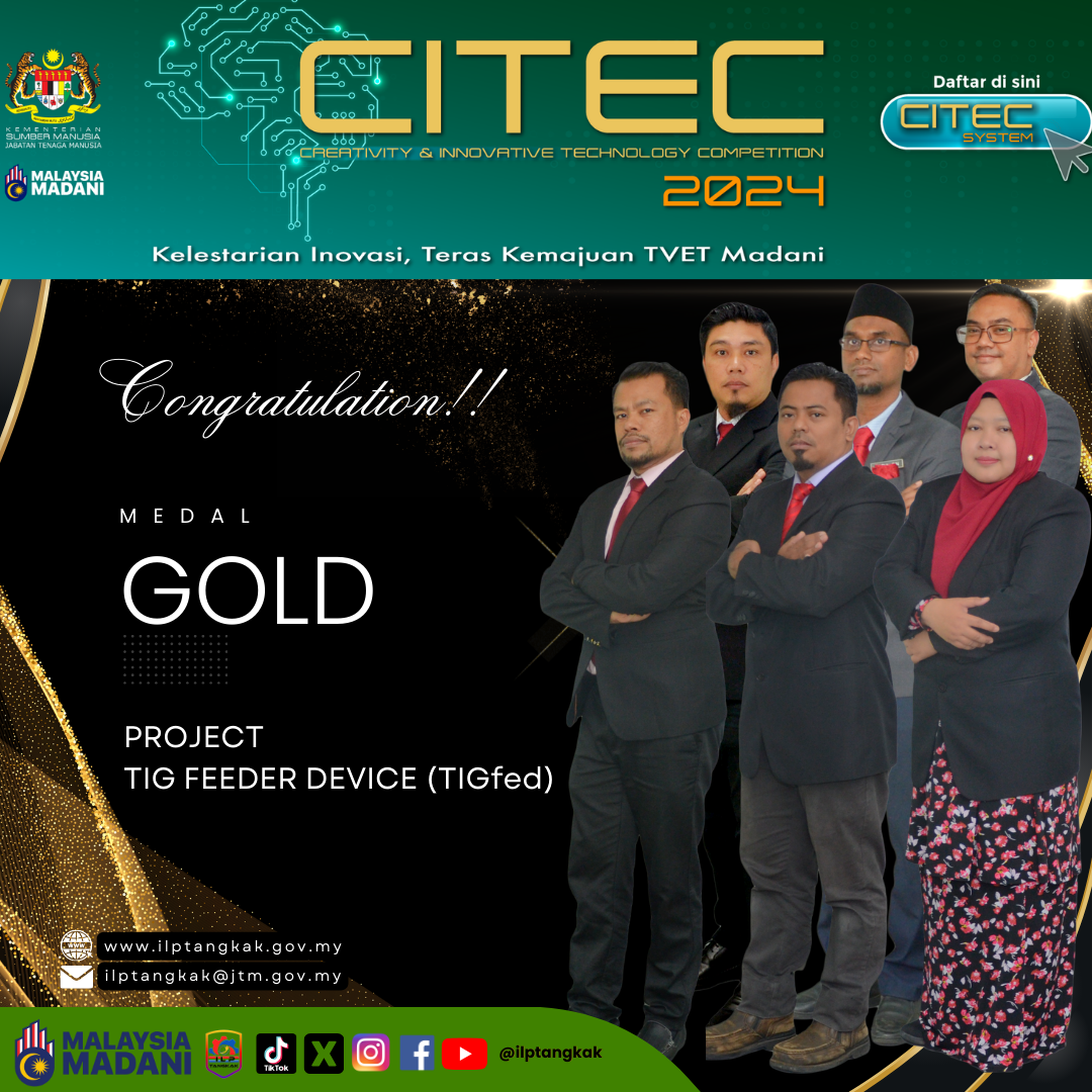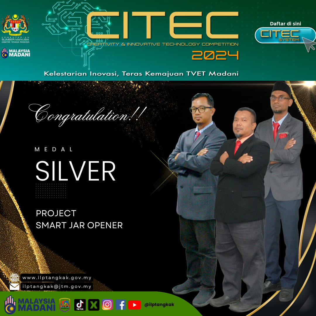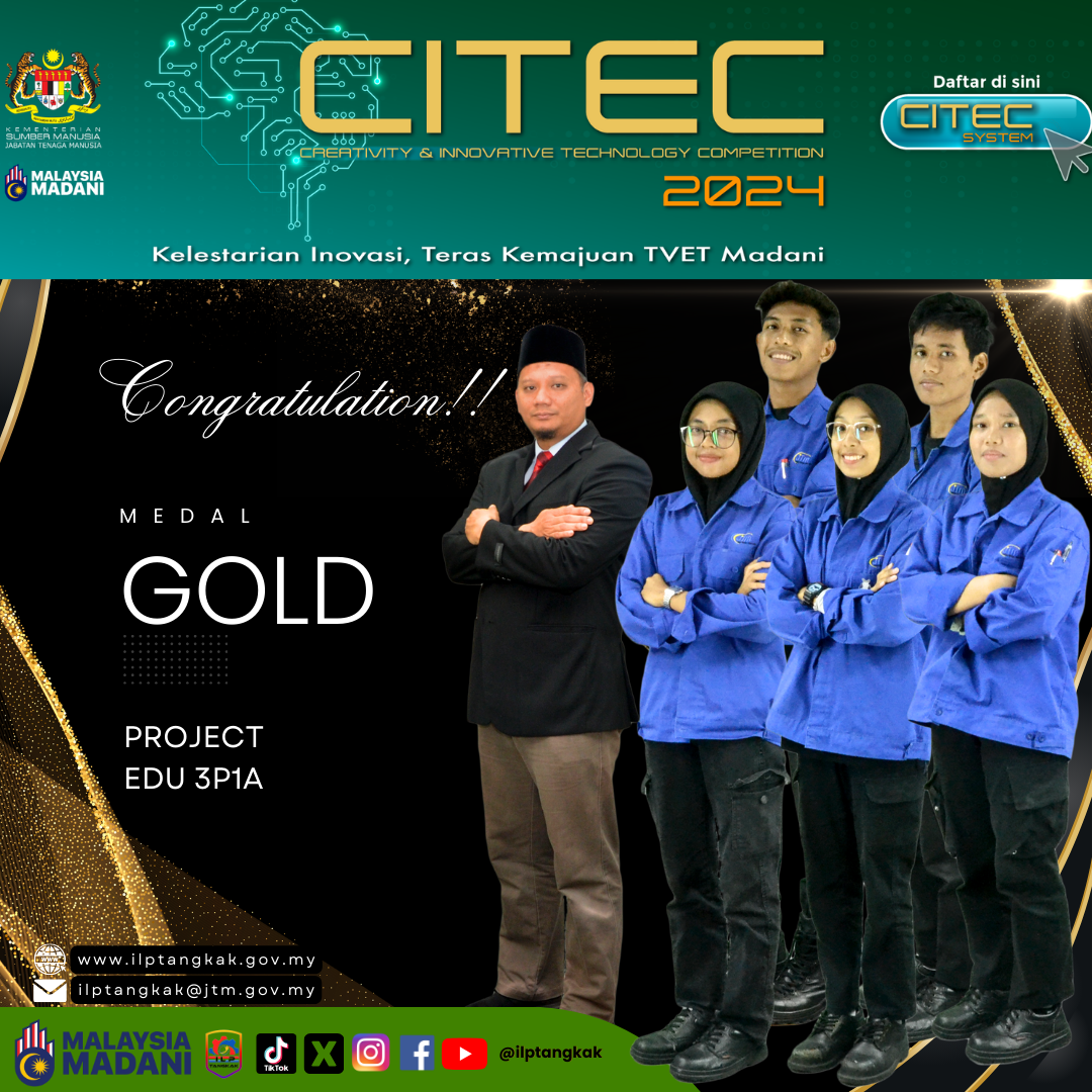 16 -17 May 2024 - ILP Tangkak has delivered 2 Innovation projects and successfully embraced the Gold Medal for both entries at the 35th International Invention, Innovation & Technology Exhibition (ITEX 2024) involving 15 countries which was held at the Kuala Lumpur Convention Centre (KLCC).