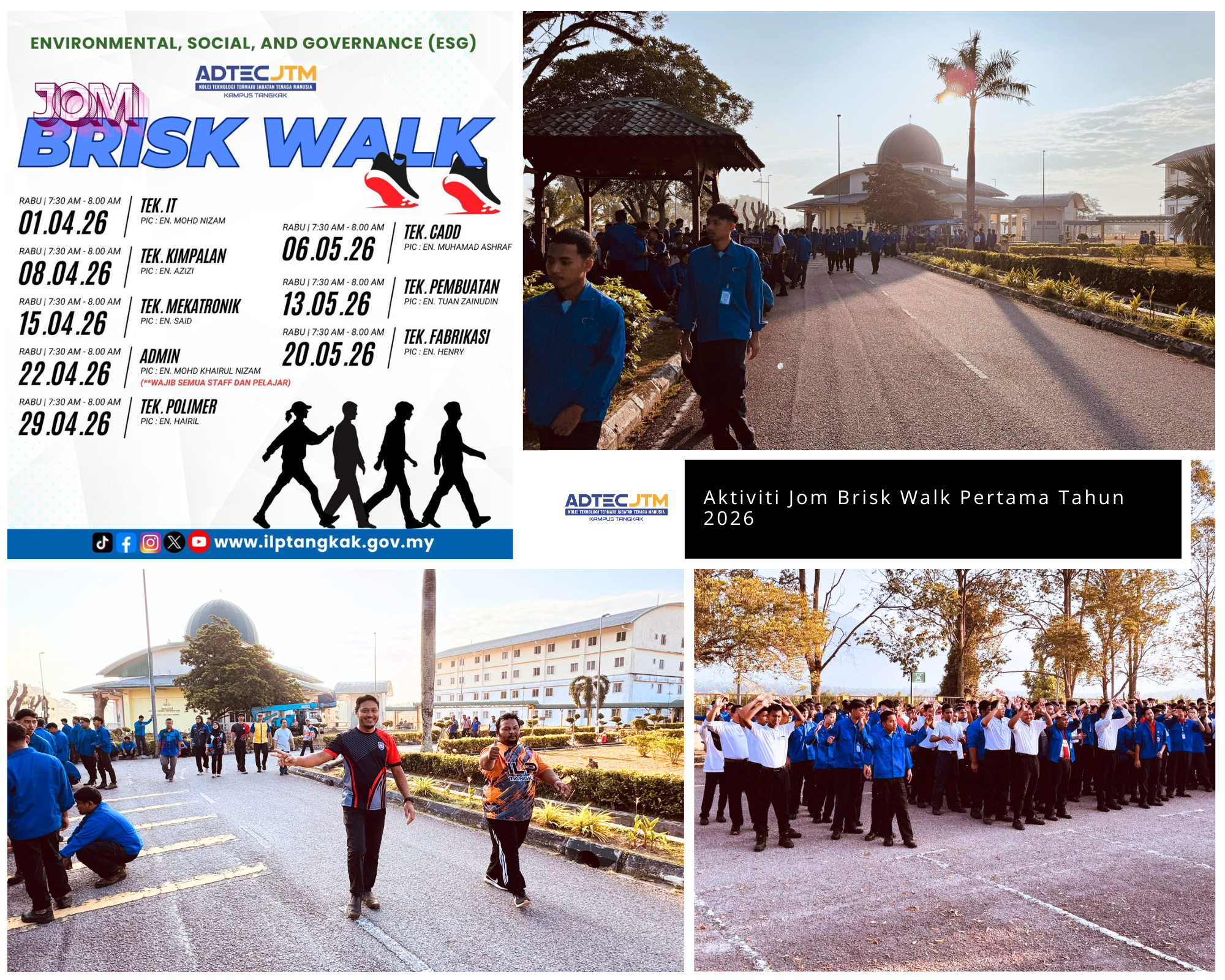1 April 2026 - Bagi menyokong usaha membudayakan gaya hidup sihat dalam kalangan warga ADTEC JTM Kampus Tangkak, Jawatankuasa Environmental, Social and Governance (ESG) kampus telah meneruskan penganjuran Aktiviti Jom Brisk Walk sebagai sebahagian daripada inisiatif aktiviti mingguan warga kampus.