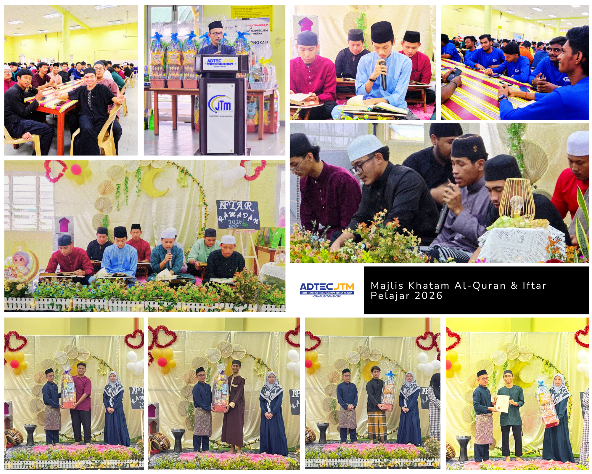 12 Mac 2026 - Alhamdulillah, Majlis Khatam Al-Quran dan Iftar Pelajar 2026 telah berlangsung dengan penuh keberkatan dalam suasana harmoni dan ukhuwah yang erat antara warga ADTEC JTM Kampus Tangkak. Program ini menjadi salah satu pengisian bermakna sepanjang bulan Ramadan dalam usaha menyemarakkan lagi penghayatan ibadah dalam kalangan warga institut. Program ini merupakan anjuran Bahagian Pengurusan Pelajar dan Latihan (BPPL) dengan kerjasama Majlis Perwakilan Pelajar (MPP).