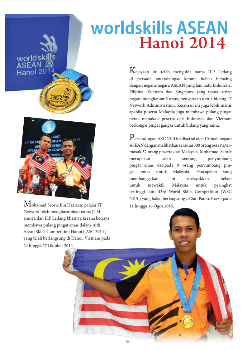 Saudara Mohamad Sabrie Bin Hazizan Pelajar Semester 5 Kursus Teknologi Komputer (Rangkaian) ILP Ledang di atas kejayaan Merangkul Pingat Emas dalam Pertandingan Kemahiran, Bidang IT Network System Administration, ASEAN di Hanoi 2014 lalu. Secara tidak langsung melayakkan diri ke World Skill Competition di Sao Paulo, Brazil yang di adakan pada 11-16 Ogos 2015.