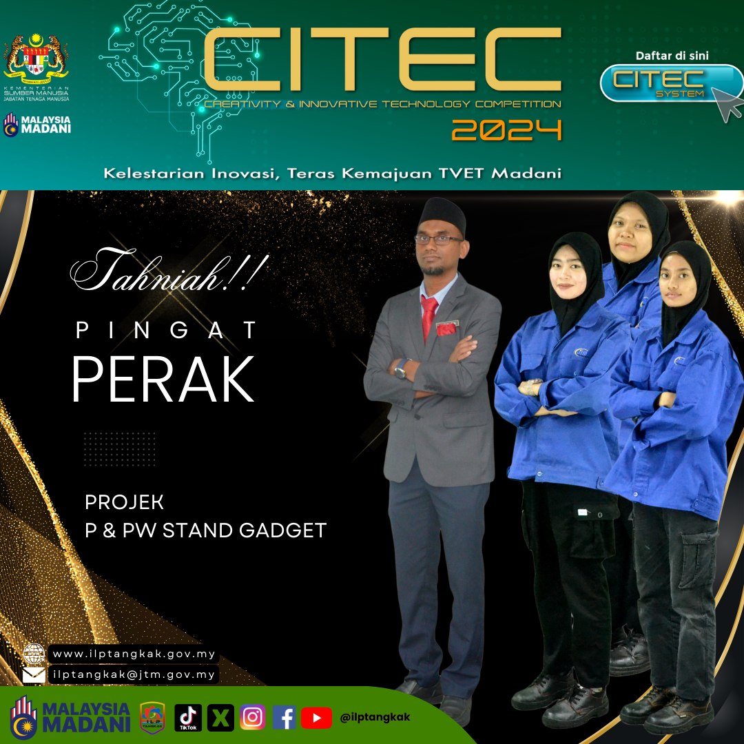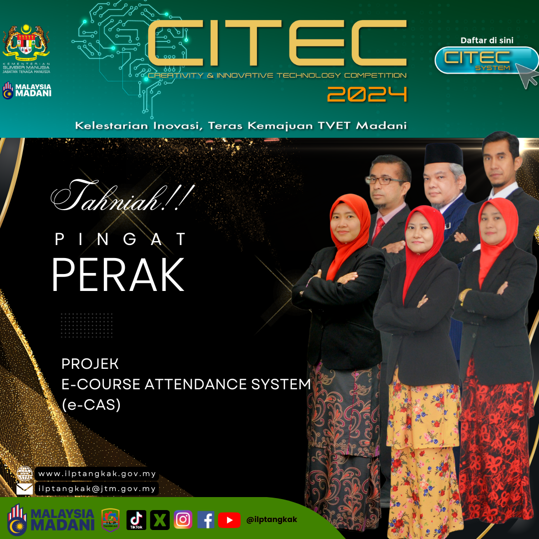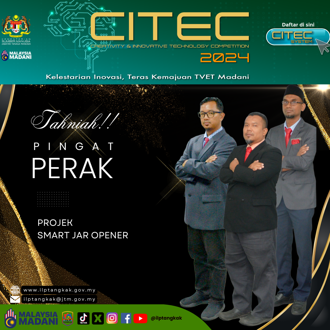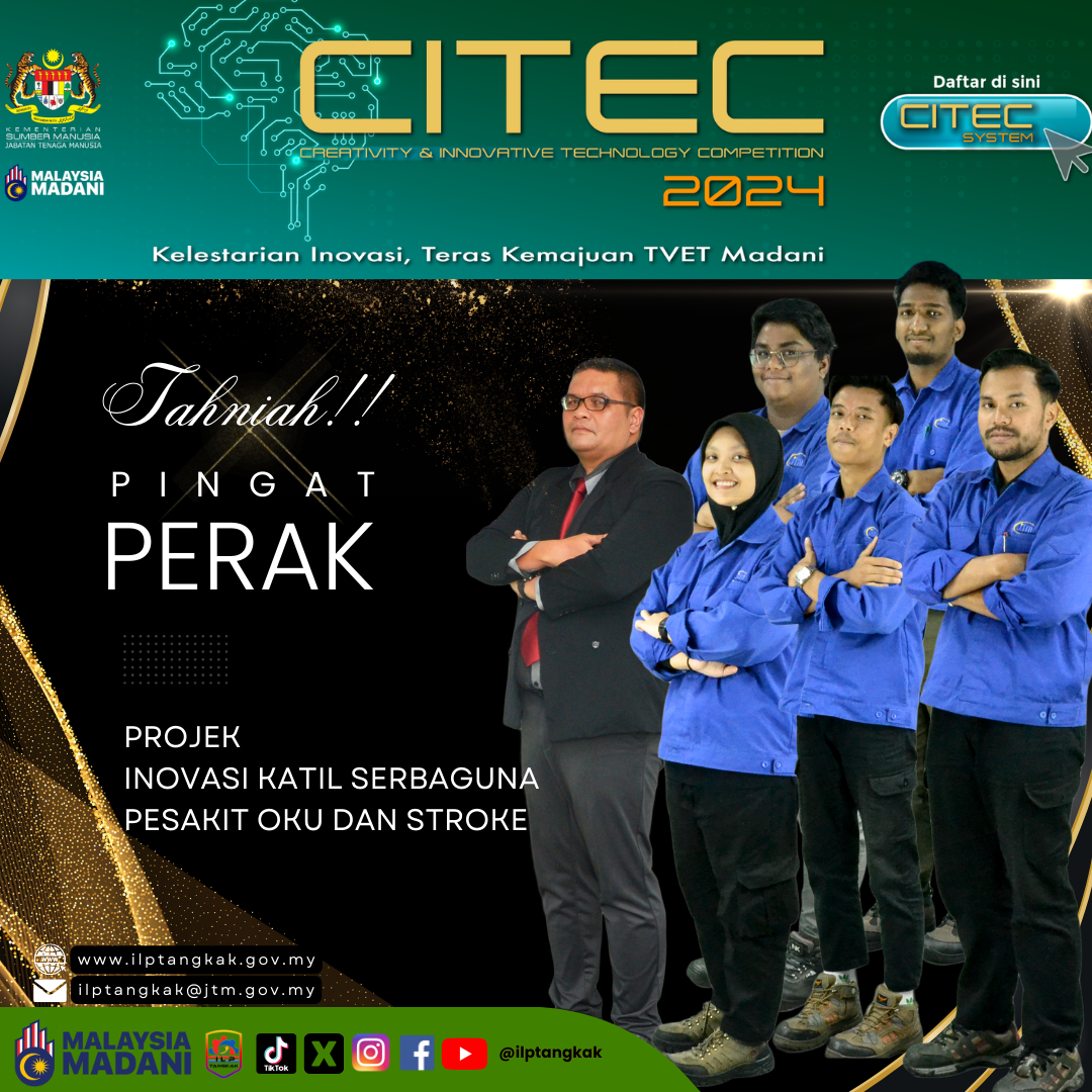 16 –17 Mei 2024 - ILP Tangkak telah menghantar 2 projek Inovasi dan berjaya merangkul Pingat Emas bagi kedua- dua penyertaan pada 35th International Invention, Innovation & Technology Exhibition (ITEX 2024) yang melibatkan 15 negara yang telah diadakan di Pusat Konvensyen Kuala Lumpur (KLCC).