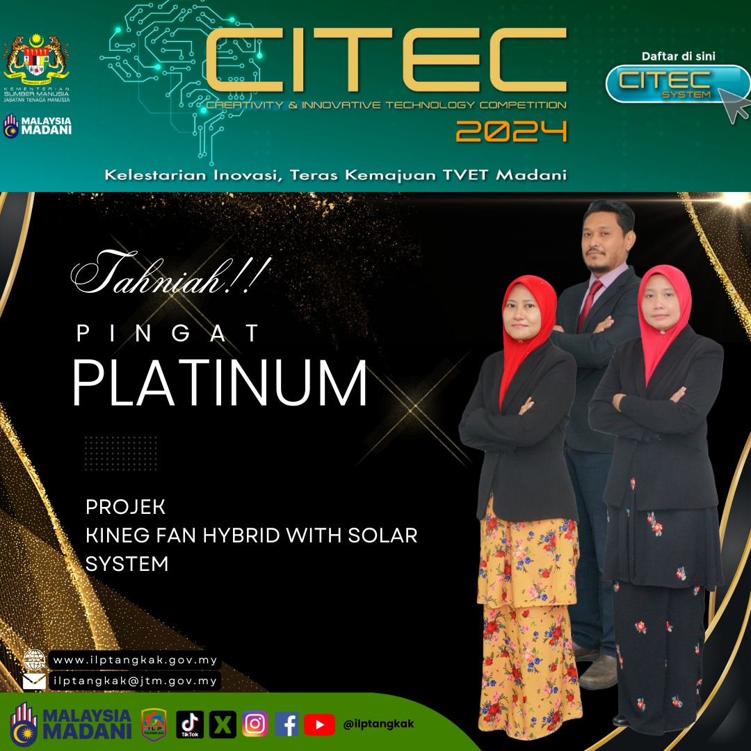Pingat Platinum - Projek Kineg Fan Hybrid With Solar System Pertandingan Kreativiti dan Inovasi Citec 2024