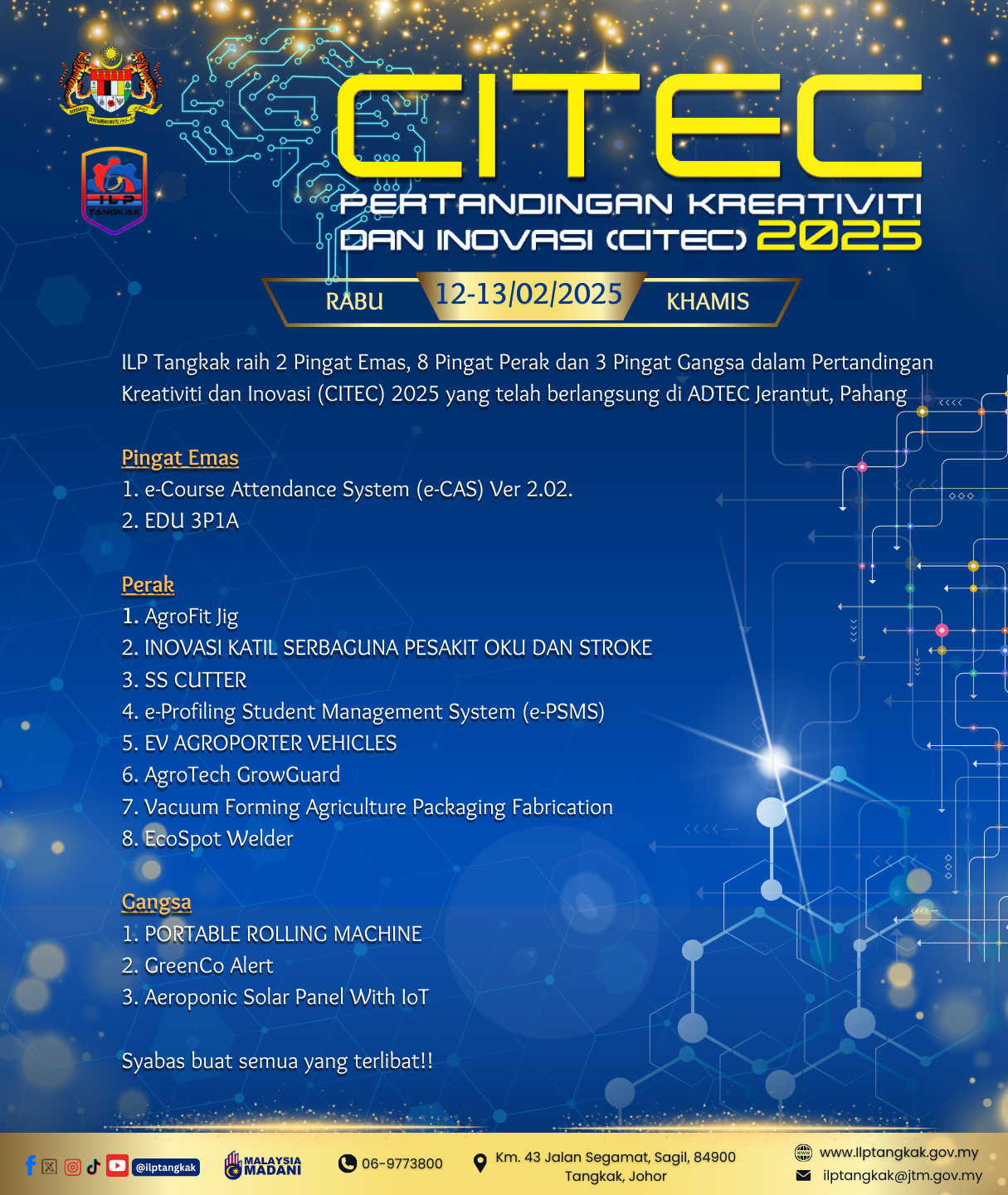 ILP Tangkak raih 2 Pingat Emas, 8 Pingat Perak dan 3 Pingat Gangsa dalam Pertandingan Kreativiti dan Inovasi (CITEC) 2025 yang telah berlangsung di ADTEC Jerantut.