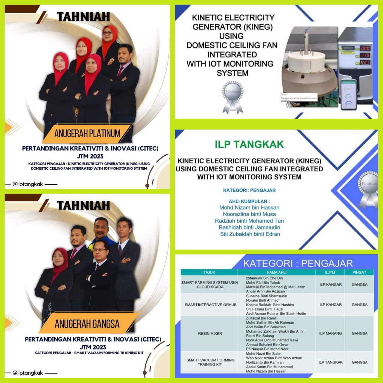 Institut Latihan Perindustrian Tangkak telah menghantar penyertaan bagi projek inovasi 𝑲𝒊𝒏𝒆𝒕𝒊𝒄 𝑬𝒍𝒆𝒄𝒕𝒓𝒊𝒄𝒊𝒕𝒚 𝑮𝒆𝒏𝒆𝒓𝒂𝒕𝒐𝒓 (𝑲𝒊𝒏𝒆𝑮) 𝒘𝒊𝒕𝒉 𝑰𝒐𝑻 𝑴𝒐𝒏𝒊𝒕𝒐𝒓𝒊𝒏𝒈 𝑺𝒚𝒔𝒕𝒆𝒎 dan telah mendapat pingat Emas dalam pertandingan tersebut.