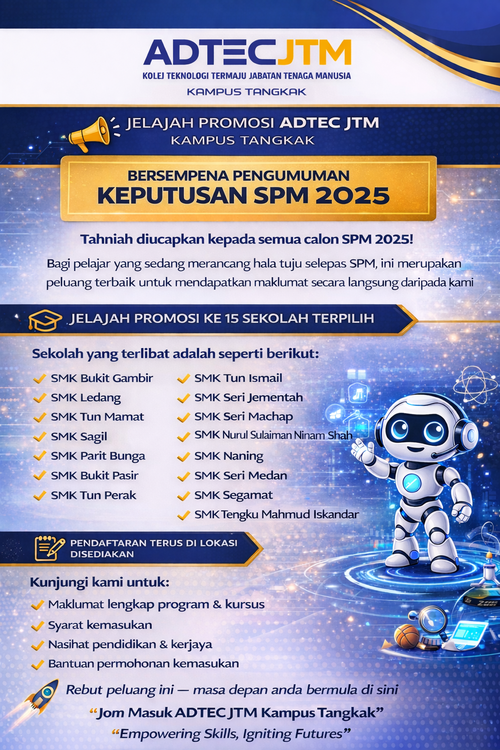 ADTEC JTM Kampus Tangkak akan mengadakan sesi jelajah promosi ke 15 buah sekolah terpilih bagi membantu para pelajar membuat keputusan yang lebih jelas dan tepat demi masa depan mereka.