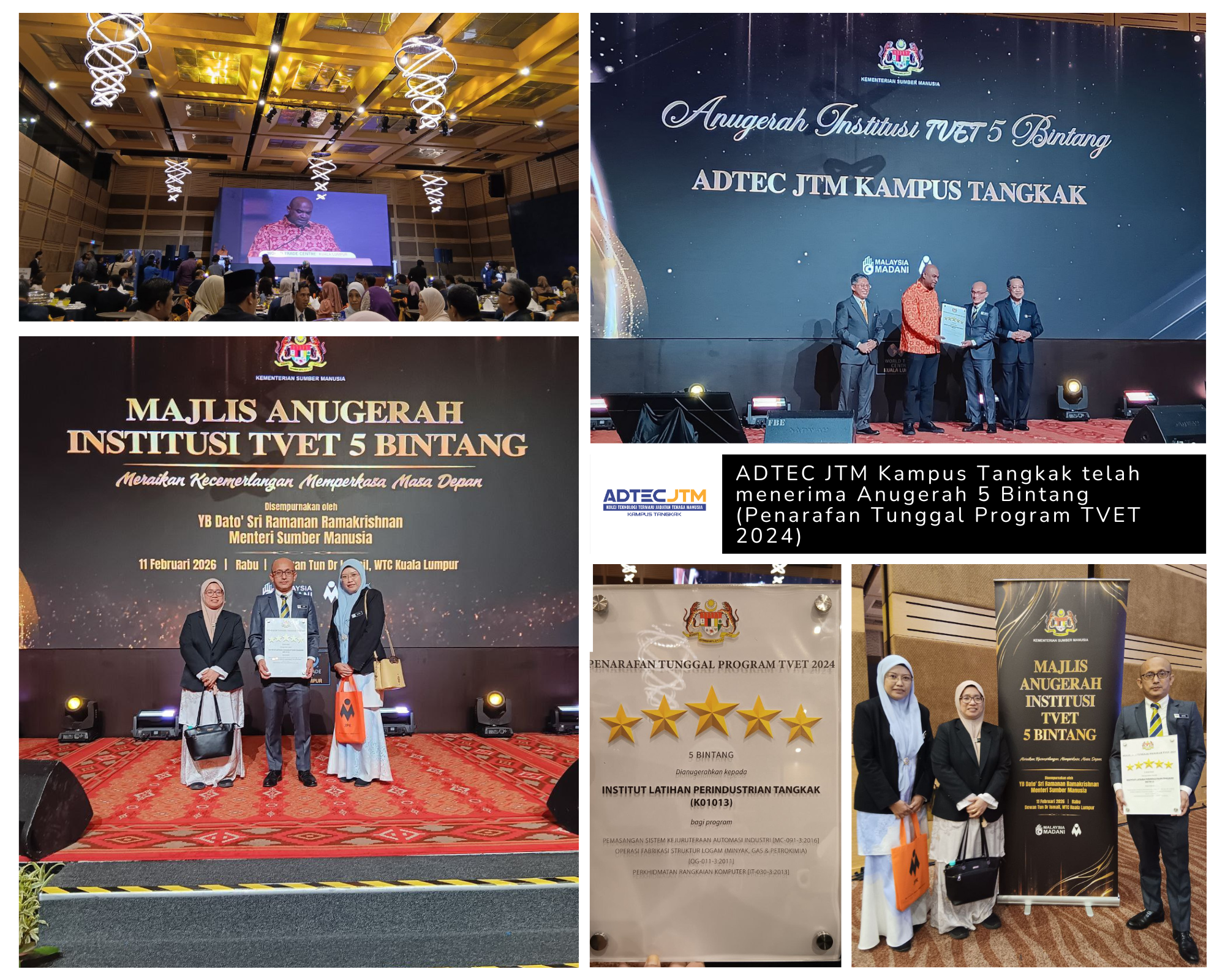 Kuala Lumpur, 11 Februari 2026 || Pengarah ADTEC JTM Kampus Tangkak, En Ahmad Jefri bin Sabri telah menghadiri Majlis Anugerah Institusi TVET 5 Bintang yang berlangsung di Dewan Tun Dr. Ismail, World Trade Centre Kuala Lumpur.