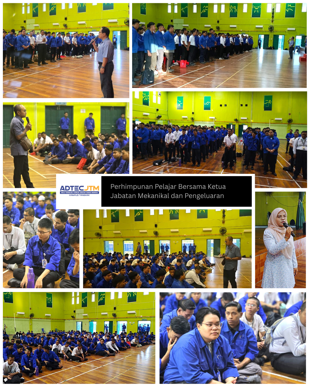 12 Januari 2026 - Satu perhimpunan pelajar bersama Ts. Mohd Nazri bin Salim, Ketua Jabatan Mekanikal dan Pengeluaran, telah berlangsung dengan jayanya di Dewan Serbaguna ADTEC JTM Kampus Tangkak. Program ini dianjurkan oleh Bahagian Pengurusan Pelajar dan Latihan sebagai platform komunikasi dan penyelarasan antara pihak pengurusan dan para pelajar.