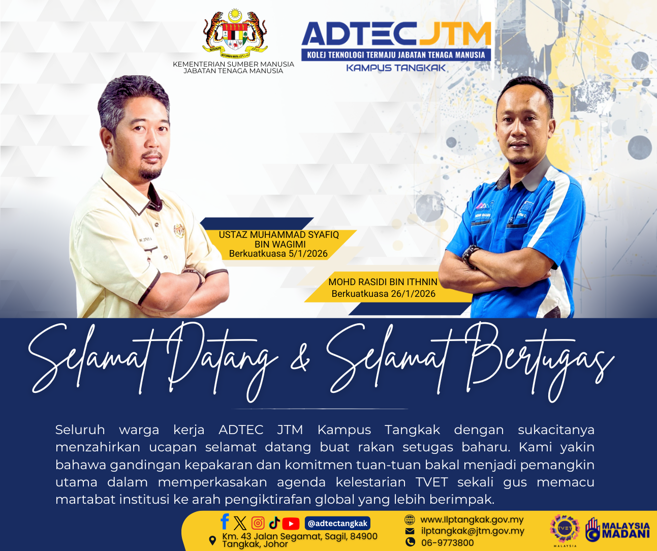 Seluruh warga ADTEC JTM Kampus Tangkak dengan sukacitanya menzahirkan ucapan selamat datang buat rakan setugas baharu.