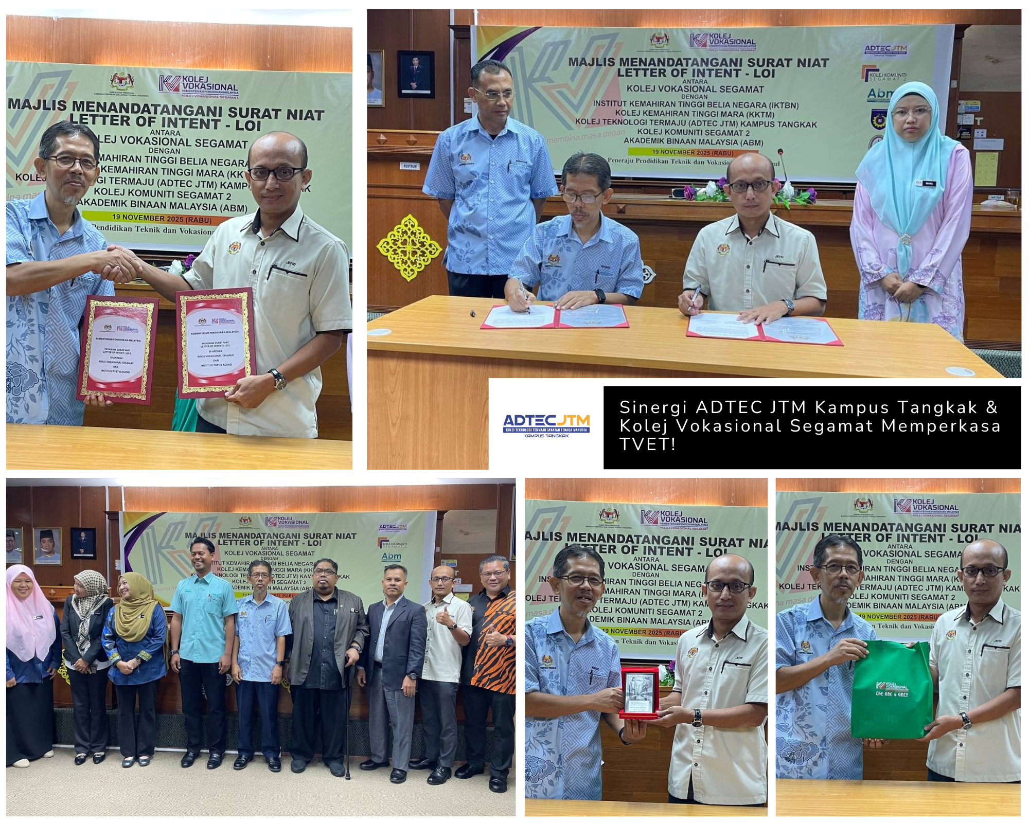 19 November 2025 - Tahniah diucapkan kepada ADTEC JTM Kampus Tangkak atas kerjasama menandatangani Surat Niat (LOI) bagi bidang Teknologi Pemesinan Industri dan Teknologi Kimpalan dengan Kolej Vokasional Segamat beserta 8 Institusi TVET lain yang telah diadakan di Kolej Vokasional Segamat.